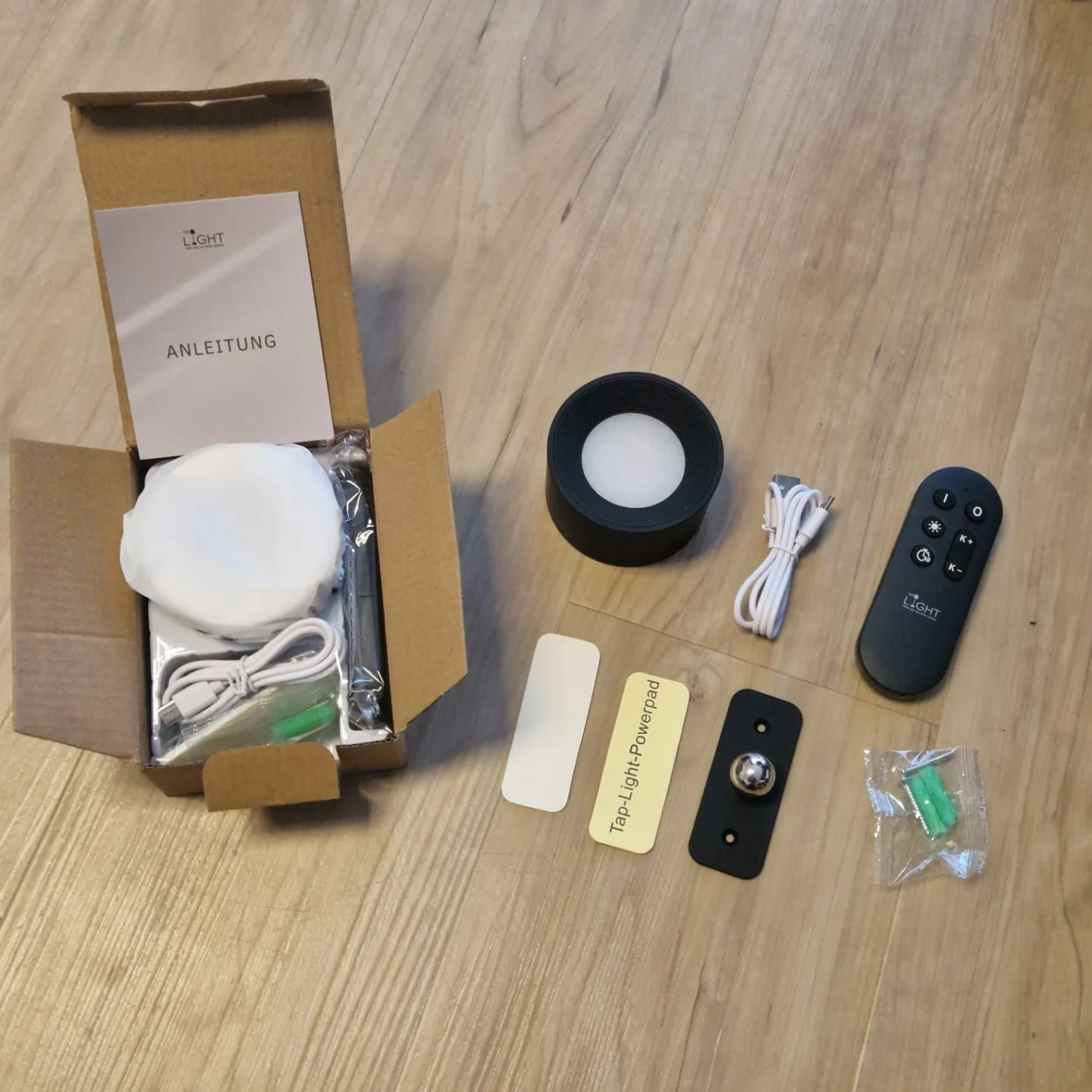 Die AURORA Wandleuchte wird mit großer Sorgfalt verpackt, um sicherzustellen, dass dieses während des Transports optimal geschützt ist. Der stabile Karton bietet eine zuverlässige Schutzschicht, die sicherstellt, dass das Produkt unbeschädigt bei ihrem Bestimmungsort ankommen. Trotz des Verzichts auf unnötigen Verpackungsmüll könnte die Verwendung von Plastikfolie für einige Verbraucher und Verbraucherinnen als kritisch angesehen werden. Die Produktverpackung enthält ein eine kabellose Wandleuchte mit magnetischem Kugelgelenk, ein USB-C-Ladekabel, zwei Klebepads, zwei Schrauben sowie eine Fernbedienung. Außerdem liegt ein Kärtchen mit QR-Code bei, das zur Bedienungsanleitung in deutscher Sprache leitet.