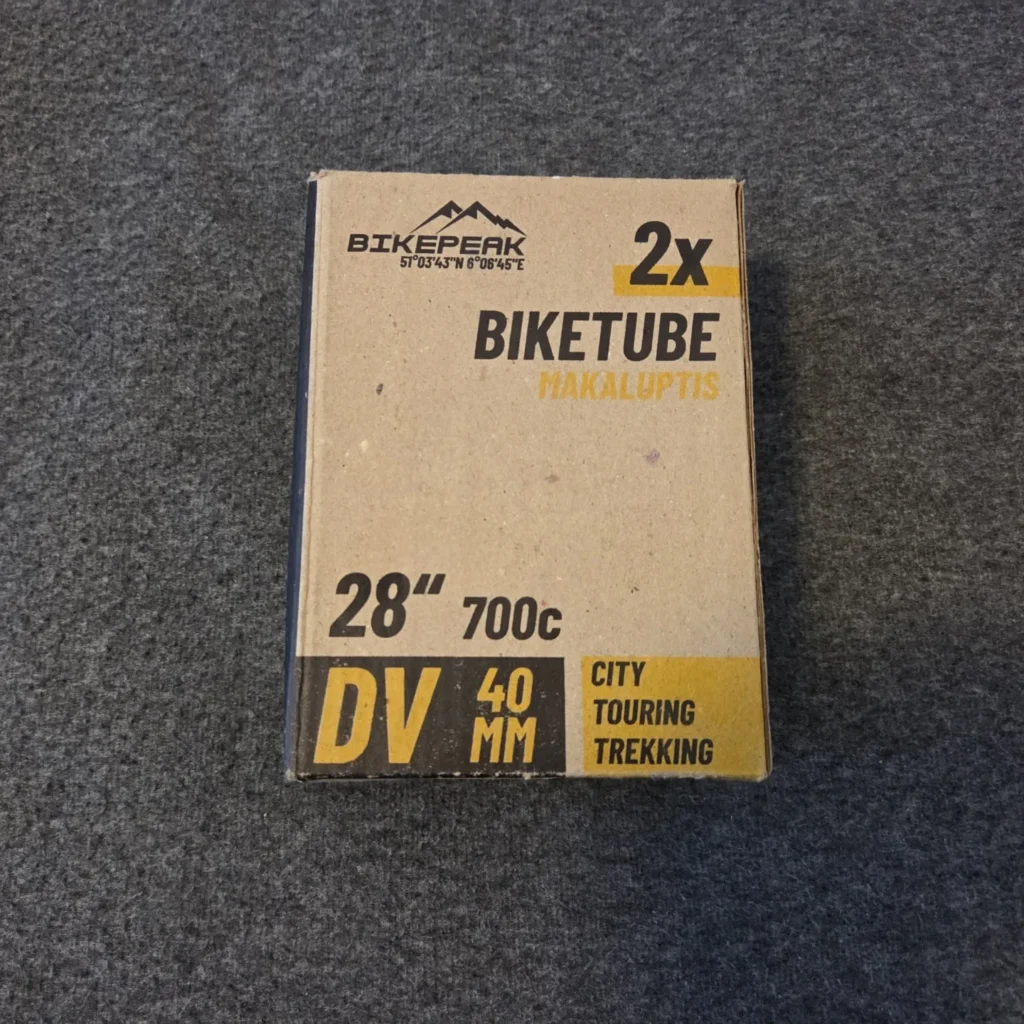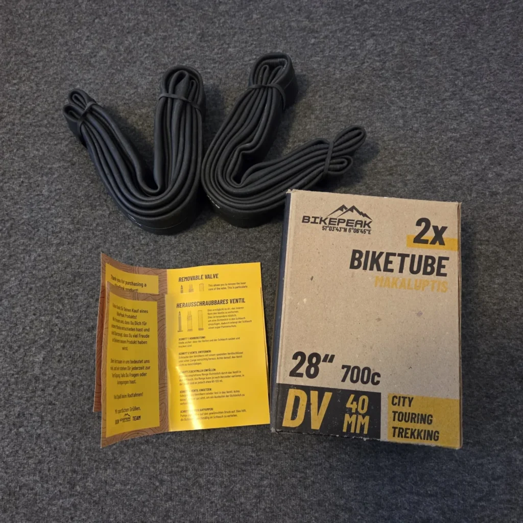 Beim Öffnen der Verpackung fällt sofort die kompakte und praktische Gestaltung ins Auge. Die beiden Schläuche sind sauber gerollt und durch eine schlichte Kartonverpackung geschützt, die sich leicht öffnen lässt. Auf der Außenseite sind alle relevanten Informationen wie Reifengrößen, Ventiltyp und Material deutlich lesbar aufgedruckt. Kein überflüssiger Schnickschnack, sondern ein funktionales Design, das auf das Wesentliche fokussiert. Die Schläuche selbst wirken auf den ersten Blick hochwertig und gleichmäßig verarbeitet. Auch das Ventil ist gut geschützt und stabil integriert. Ein kleiner Beipackzettel mit Montagehinweisen ist ebenfalls vorhanden. Insgesamt vermittelt die Verpackung einen soliden und vertrauenswürdigen Eindruck, der Lust auf den Praxistest weckt.
