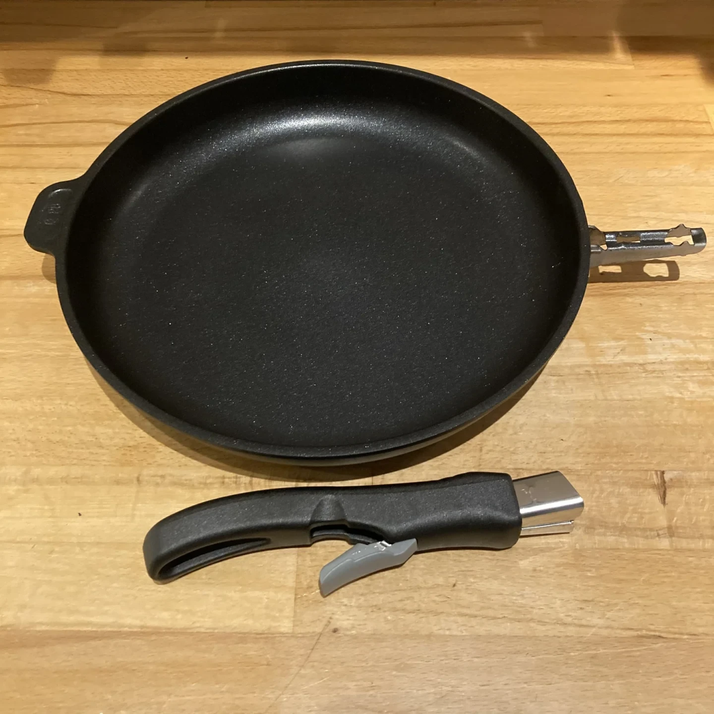 Das Gewicht fällt etwas höher aus als bei herkömmlichen Antihaftpfannen, was der massiven Bauweise und Materialstärke geschuldet ist. Dadurch wirkt die Pfanne sehr stabil und widerstandsfähig. Es sind keine Fertigungsfehler, Kratzer oder unebenen Stellen zu erkennen – die gesamte Verarbeitung macht einen exzellenten Eindruck. Der abnehmbare Griff rastet sauber ein und löst sich ohne Spiel, was Sicherheit und Komfort gleichermaßen gewährleistet.