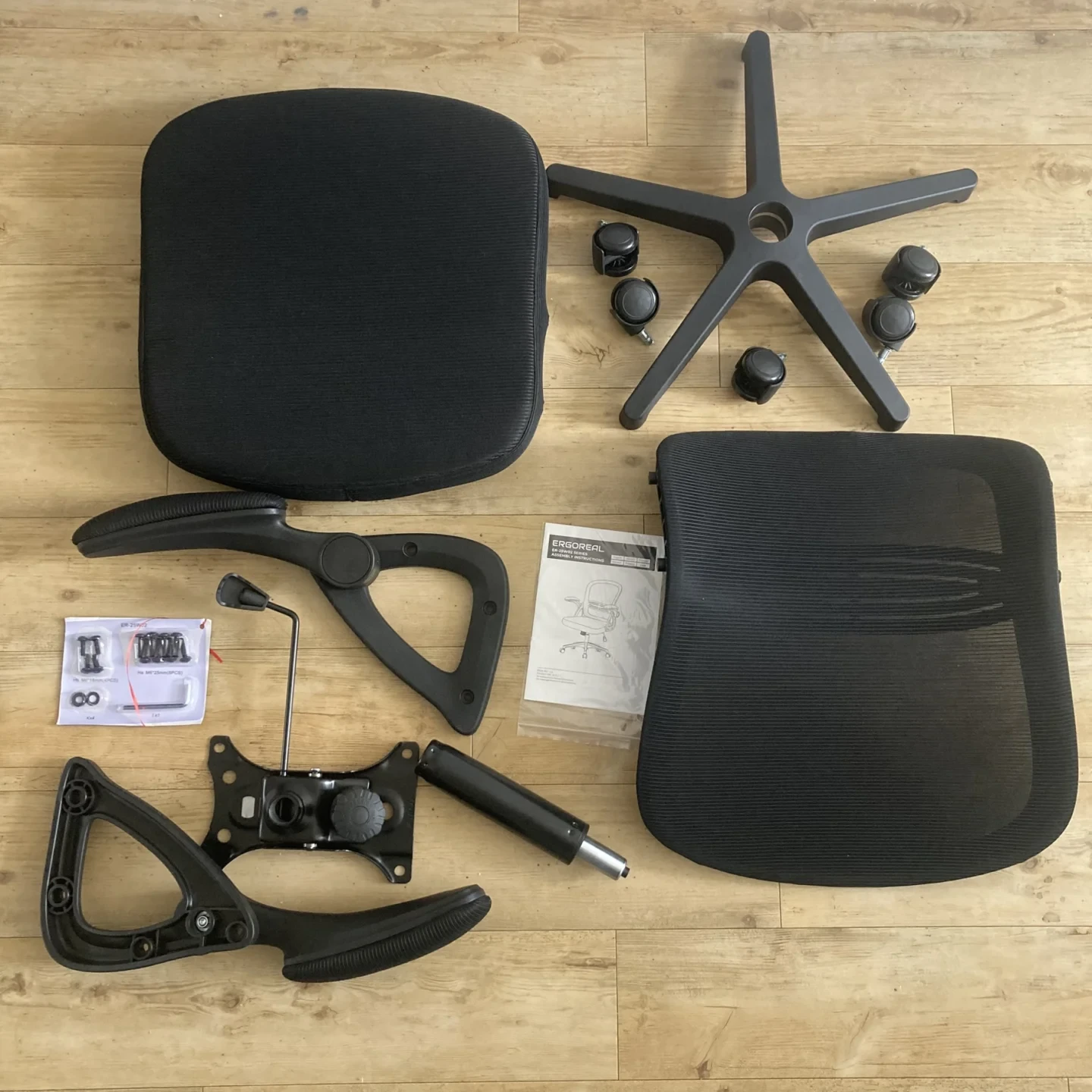 Der Ergoreal ER-25W02 wird in einem stabilen Pappkarton geliefert, der alle Einzelteile sicher verpackt enthält. Die Bauteile sind einzeln in Kunststofffolie und Luftpolsterfolie verpackt, wodurch sie während des Transports gut geschützt sind. Allerdings entsteht dadurch relativ viel Verpackungsmüll, was aus Nachhaltigkeitssicht verbessert werden könnte.