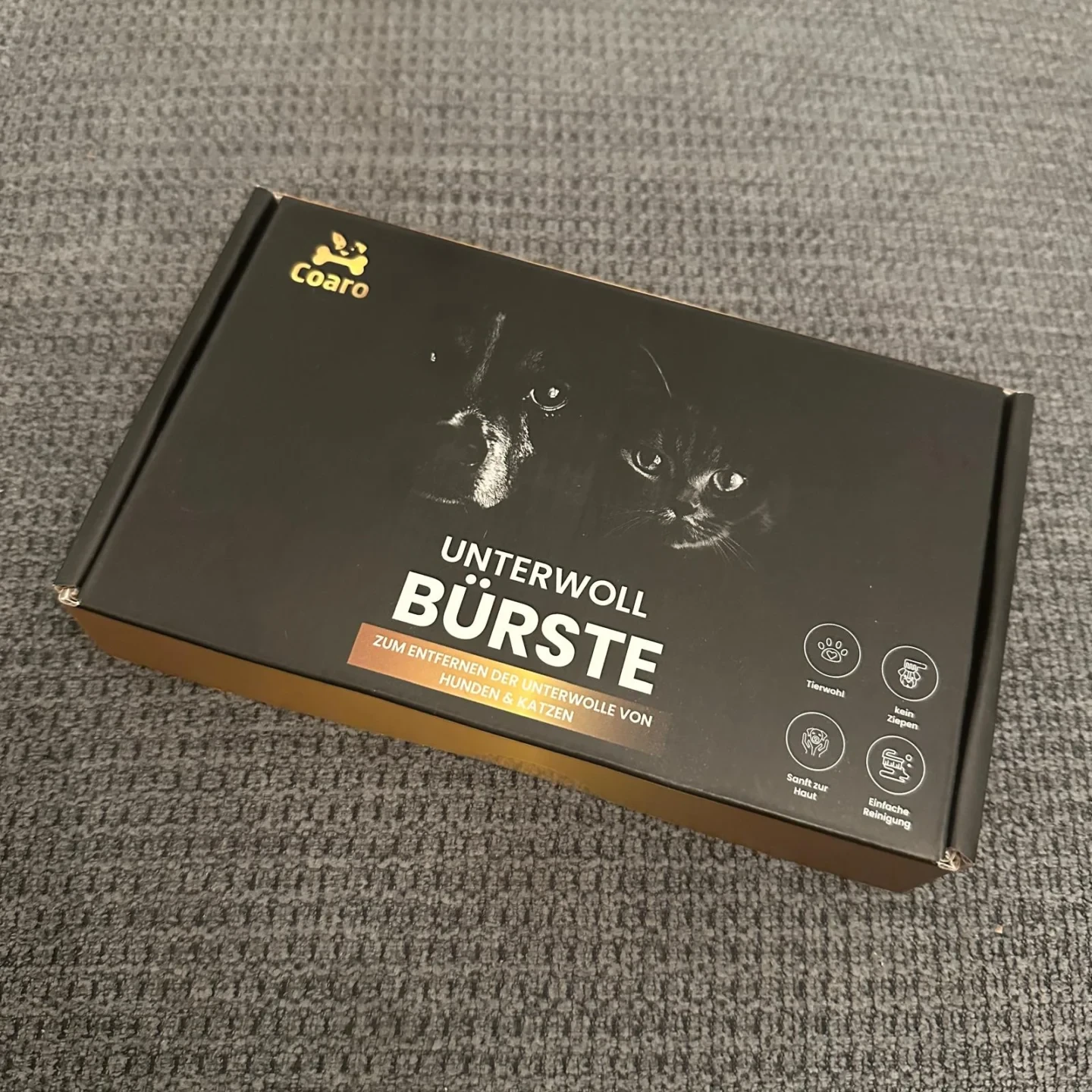 Beim Auspacken der COARO Unterwollbürste fällt sofort die stabile Kartonverpackung positiv auf. Das Produkt ist ausreichend geschützt und zeigt keinerlei Transportschäden. Auf umweltschädliche Plastikverpackungen wurde vollständig verzichtet, was wir besonders begrüßen – ein Pluspunkt im Hinblick auf nachhaltige Verpackungslösungen. Die Informationen auf der Verpackung sind klar strukturiert und bieten eine kurze, leicht verständliche Gebrauchsanweisung direkt auf der Rückseite des Kartons – völlig ausreichend für die Inbetriebnahme.