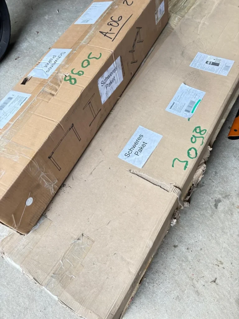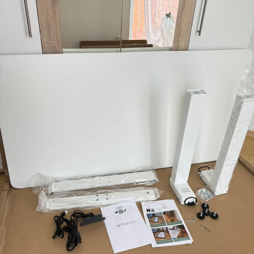 The height-adjustable desk from Wonavo is very well packaged to provide optimum protection during transport. Unfortunately, the goods were not handled with the necessary care by the haulier, so that parts of the goods were damaged even though the protection was actually perfectly adequate. Despite the avoidance of unnecessary packaging waste, the use of plastic could be seen as critical by some consumers. The product packaging contains the individual components of the height-adjustable frame, a table top and the electronics. An illustrated instruction manual in German is also included. An assembly video can also be scanned if required.
