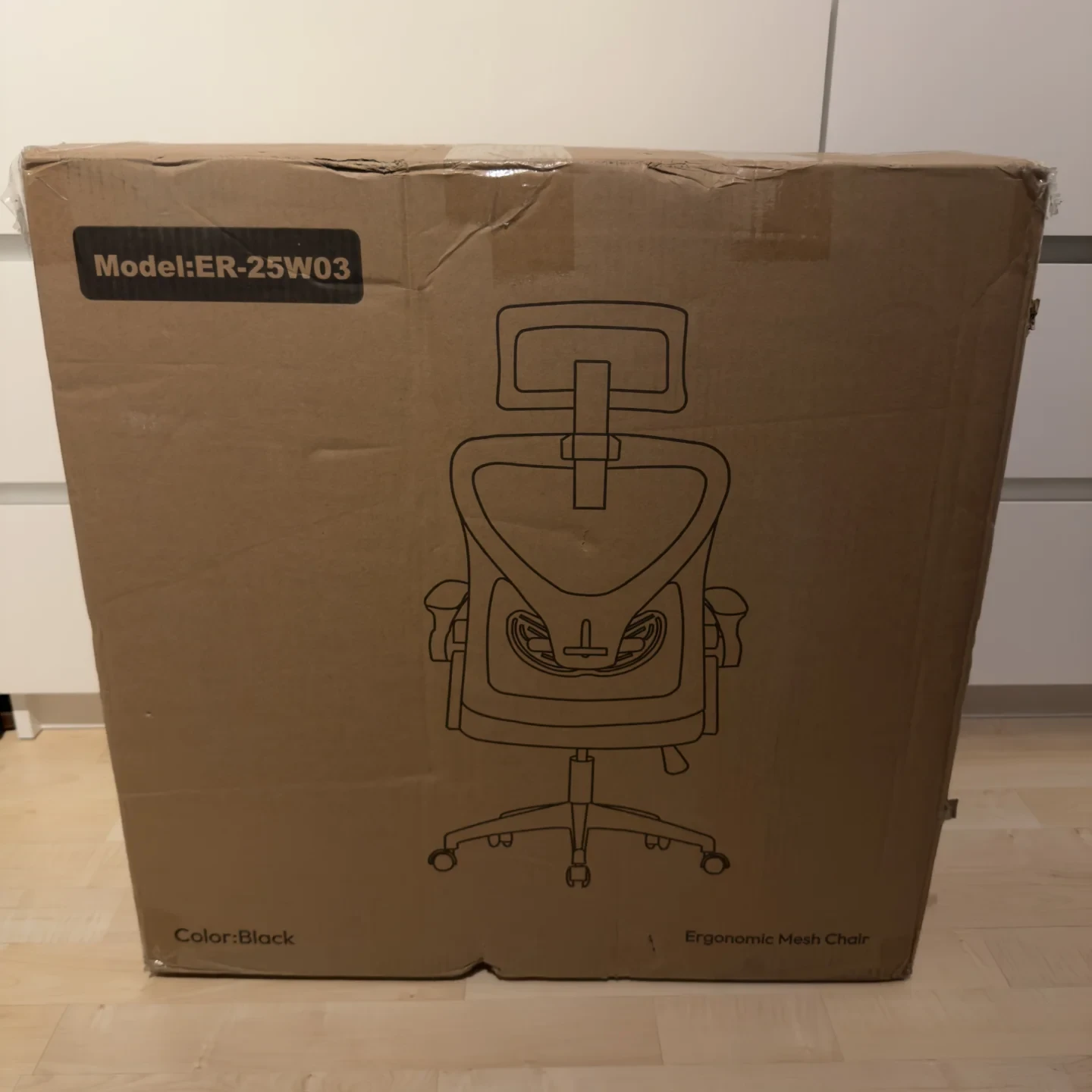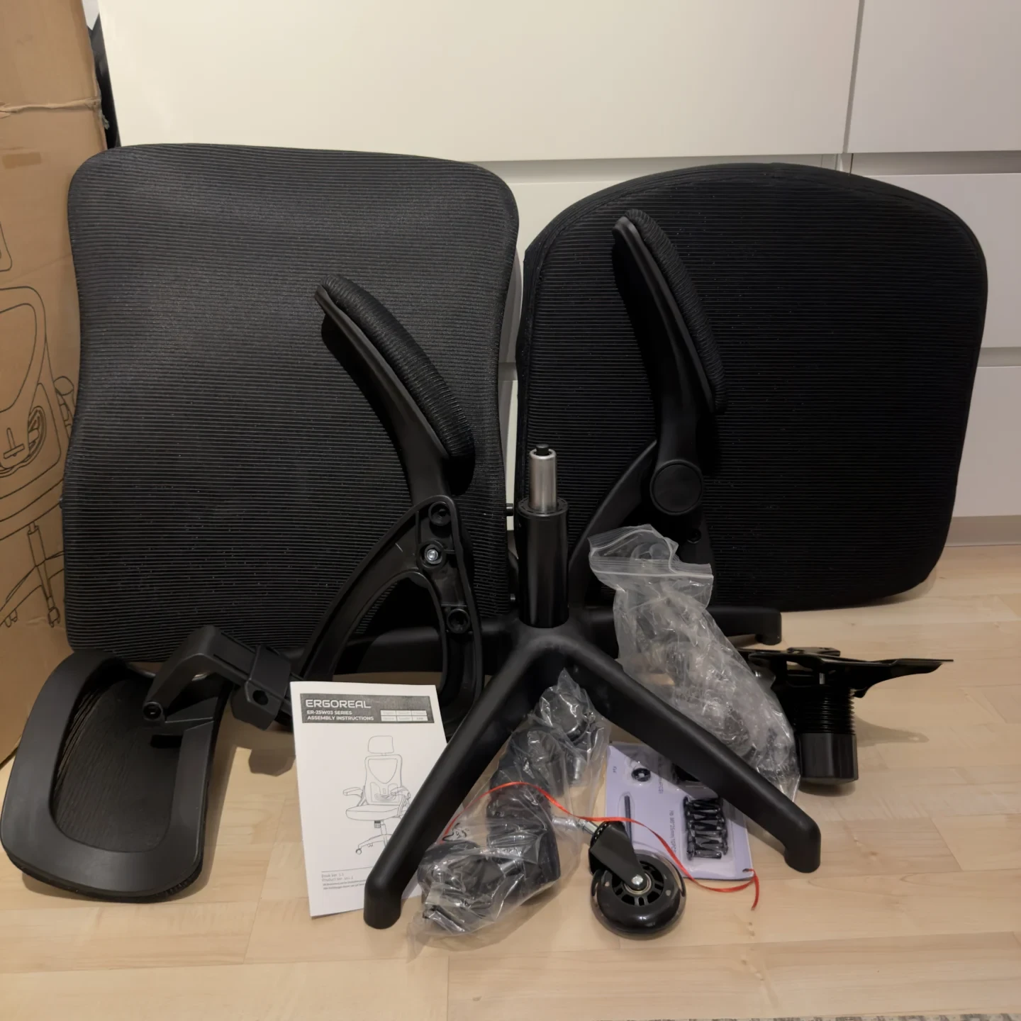 Bei dem Auspacken des Ergoreal Office Chair ER-25W03 fällt sofort die strukturierte und sichere Verpackung auf. Alle Komponenten sind ordentlich sortiert und gut geschützt, sodass Beschädigungen während des Transports vermieden werden. Das Material wirkt bereits beim ersten Kontakt hochwertig: Das Netzgewebe ist straff gespannt und robust, während die Kunststoff- und Metallteile sauber verarbeitet erscheinen.