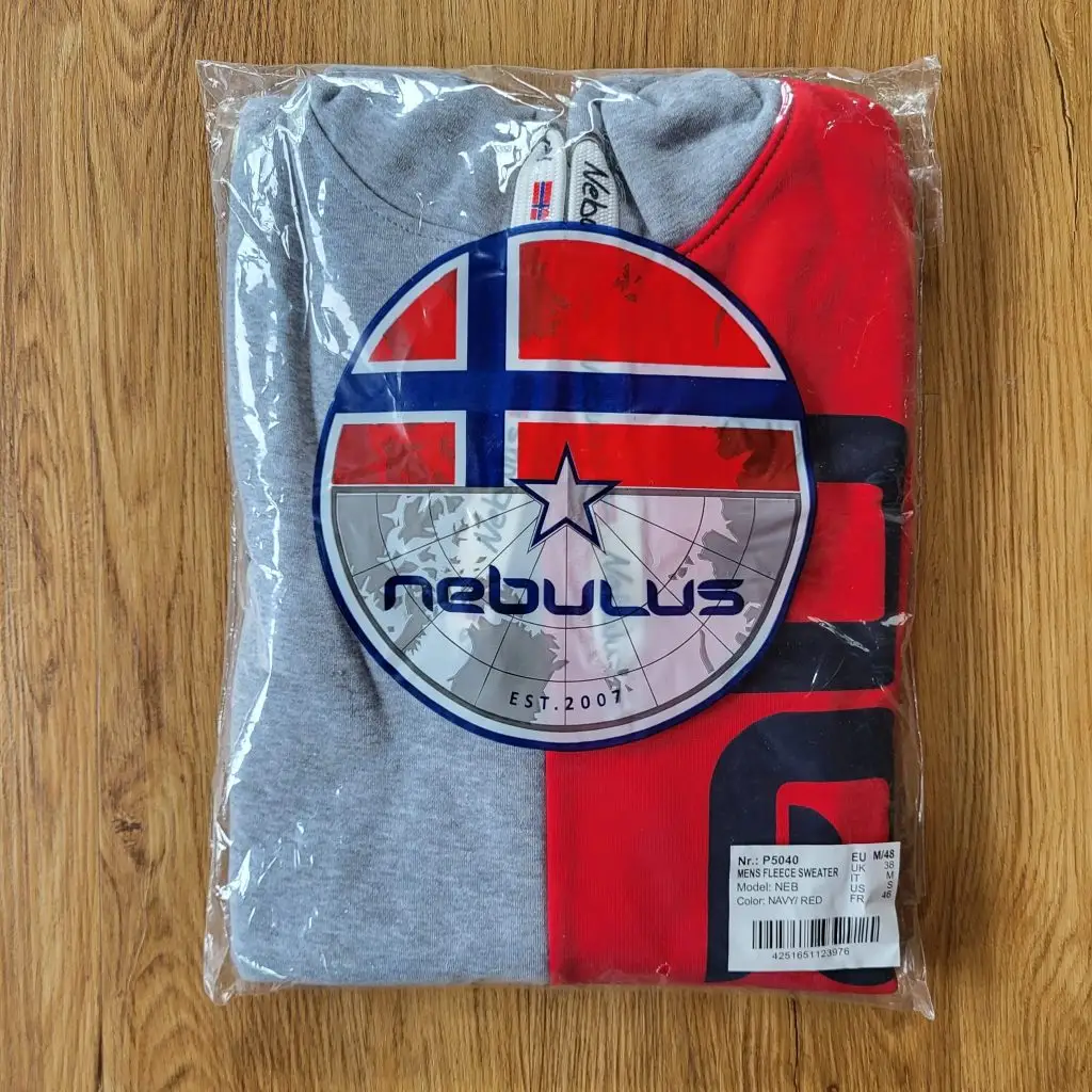 En conjunto, la sudadera con capucha gris, azul marino y roja, los parches Nebulus y la bandera noruega son una prenda de moda, polarizadora y atractiva al mismo tiempo . La calidad de los tejidos utilizados y de las costuras, así como la confección en general, también son impresionantes .