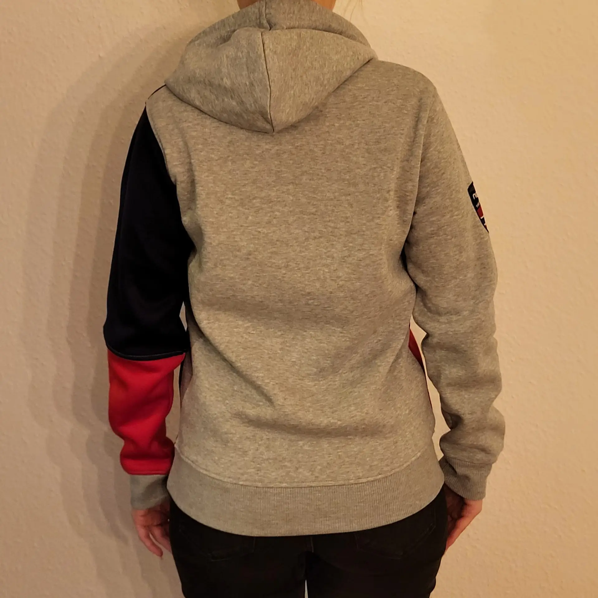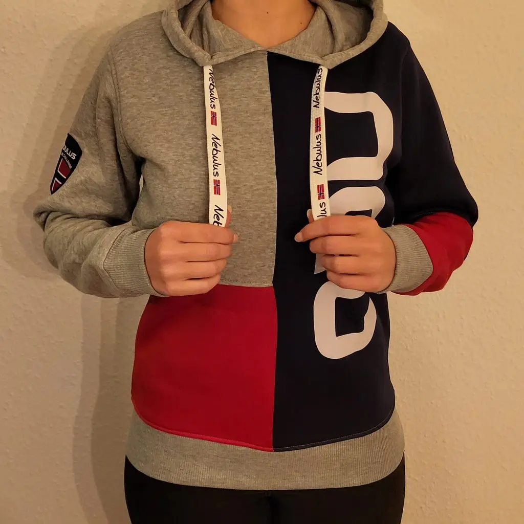 Como contraste de color con el color base gris, la sudadera tiene un parche que cita el nombre del fabricante, Nebulus, y la bandera noruega. En el caso de la sudadera con capucha para mujer, el parche está cosido en azul marino. El parche está situado en la parte superior del brazo derecho. La mitad de la parte delantera de la sudadera y la mitad de la manga izquierda son de color azul marino. «neb» está impreso en letras blancas en la parte azul de la sudadera con capucha. En cambio, el cuarto inferior de la sudadera y un cuarto de la manga izquierda son de color rojo. La banda de la sudadera tiene dos centímetros de ancho y es de color blanco. Nebulus y la bandera noruega están impresos en negro sobre el fondo blanco. La banda de la capucha sale de ésta a través de ojales metálicos plateados. Los ojales metálicos antidesgaste permiten usar la sudadera con suavidad sin tener que preocuparse de que el tejido se deshilache. La sudadera con capucha para hombre tiene los mismos colores, pero en una disposición diferente. La disposición de las combinaciones de colores cambia en función del color base.