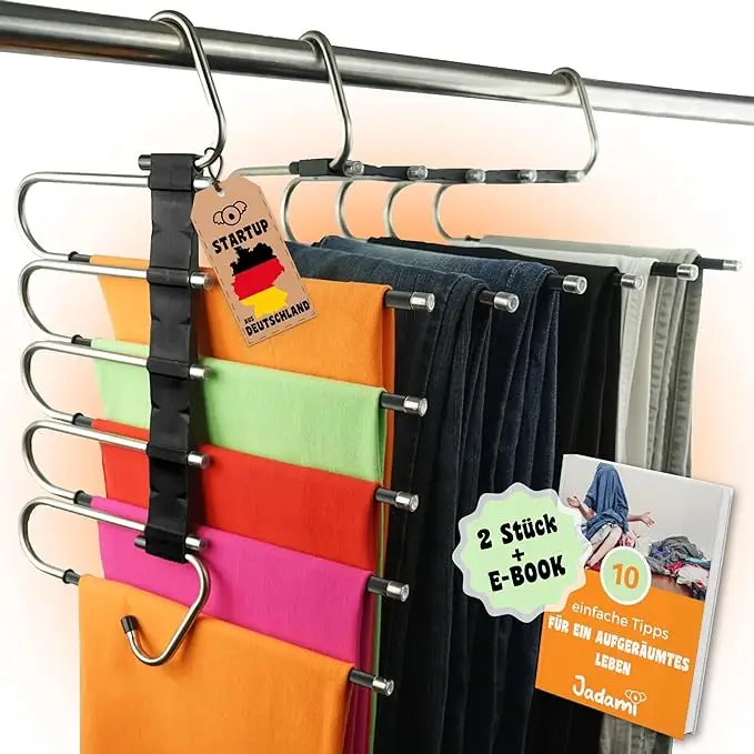 El juego de perchas Jadami ofrece una solución práctica para colgar pantalones y otras prendas ahorrando espacio . Las perchas múltiples plegables para pantalones crean hasta un 80% más de espacio en el armario y mantienen todo organizado y ordenado . Su construcción extra resistente permite colgar con seguridad incluso prendas pesadas, mientras que el sistema antideslizante garantiza que la ropa no resbale. El sistema organizador ayuda a mantener el armario ordenado y también proporciona consejos útiles para tener más orden en la vida diaria.