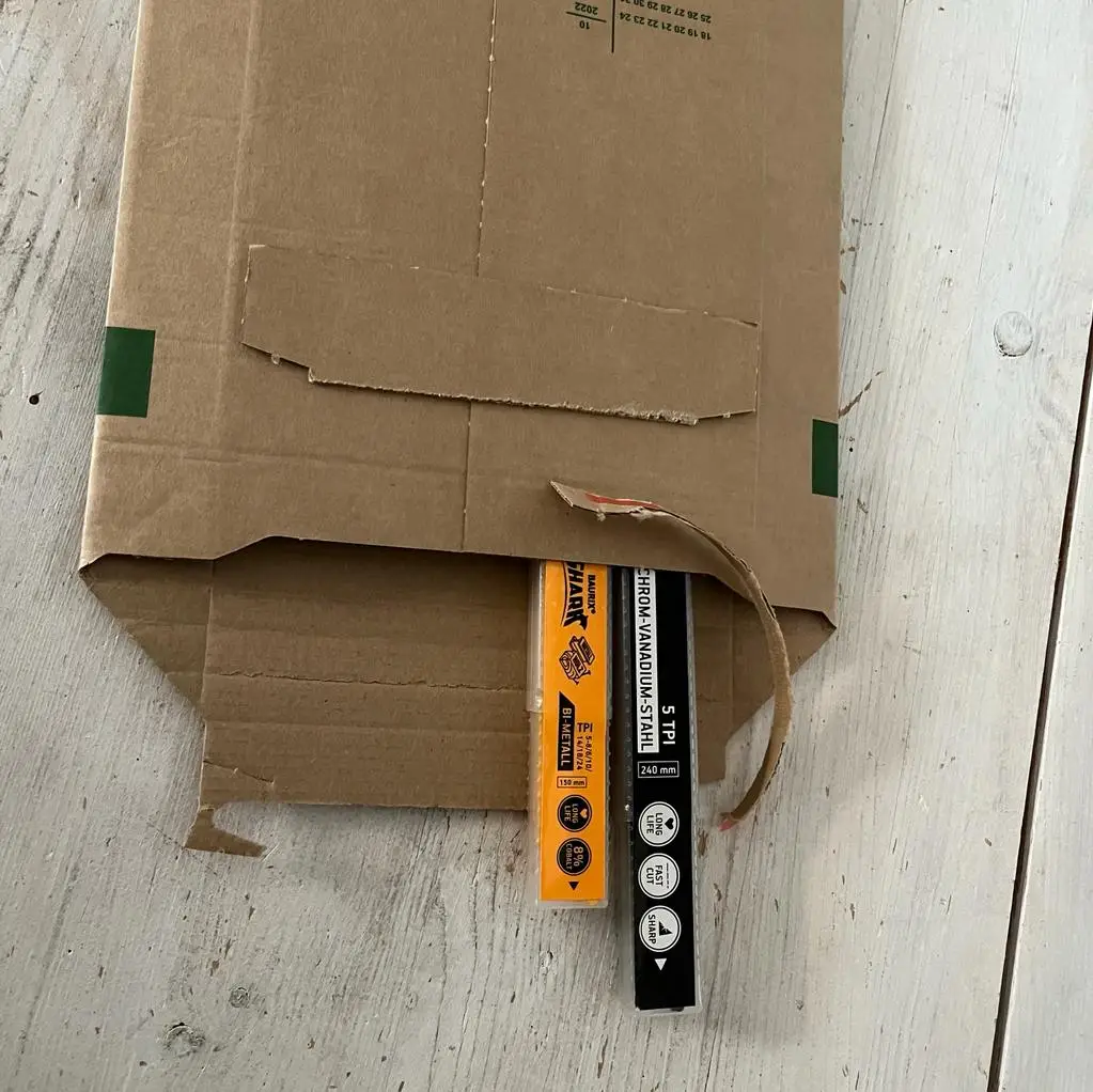Après le déballage, deux choses ont été trouvées sur l’établi. Outre les cinq ou six lames de scie sabre, une boîte en plastique solide a été fournie pour chacune d’entre elles afin d’éviter d’éventuelles blessures à l’utilisateur. Il n’y a pas d’indications concernant l’utilisation et l’entretien du produit, mais elles ne sont pas non plus obligatoires pour ce produit. Les informations de contact sont indiquées sur la boîte d’emballage. Dans l’ensemble, nous parlons ici d’une manière extraordinairement bien pensée et conviviale d’expédier un produit.