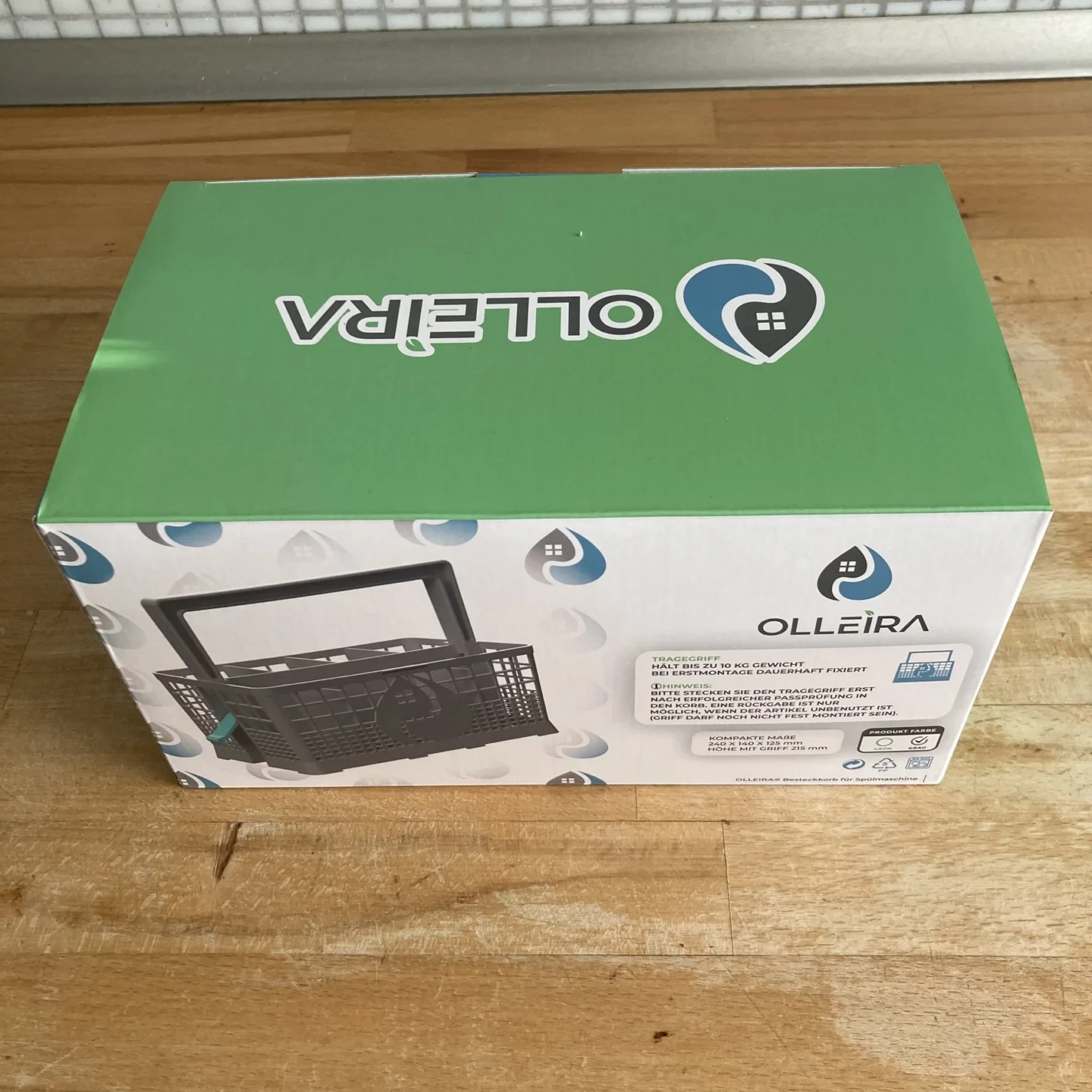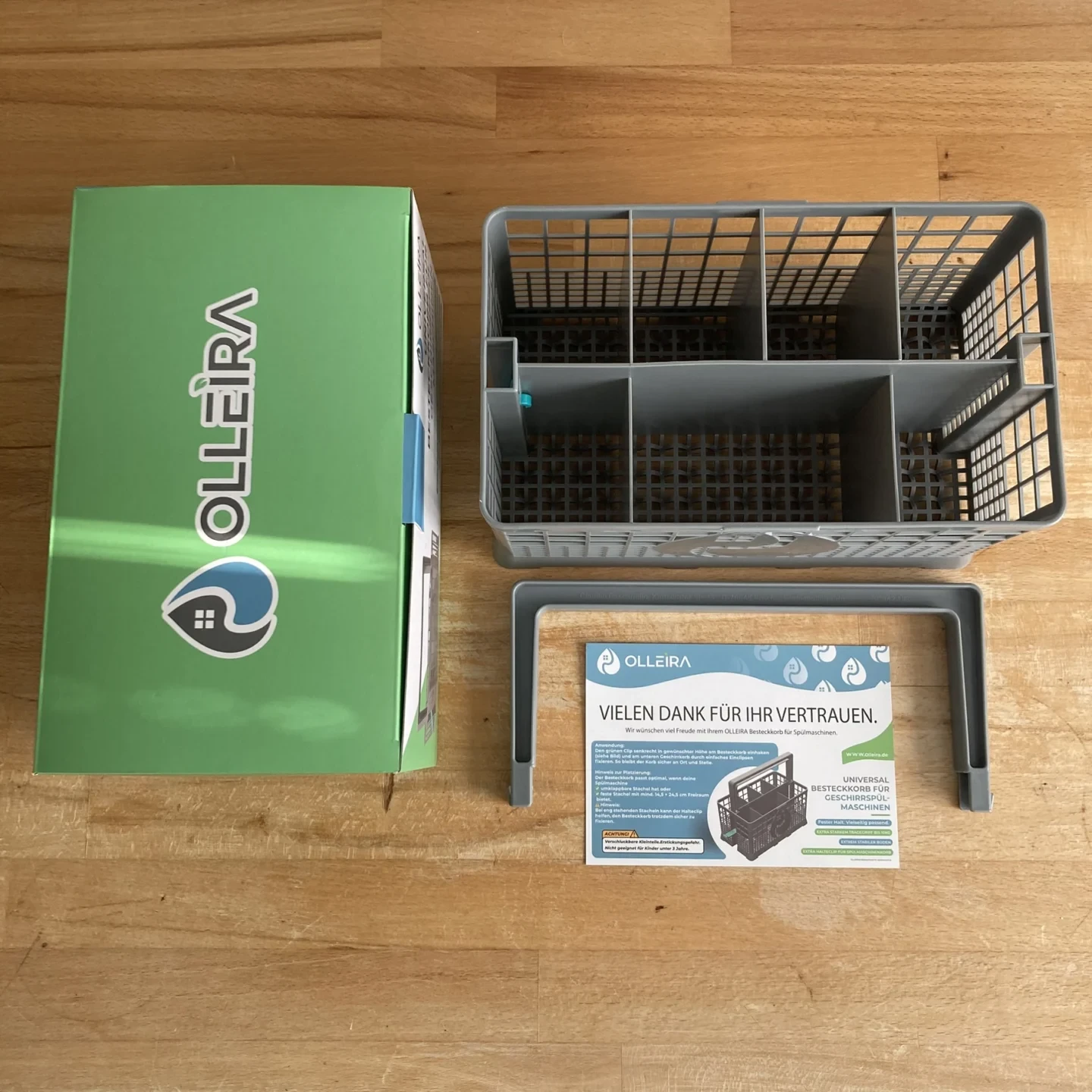 Der Olleira FixClip Besteckkorb wurde in einer kompakten und auf die Produktgröße angepassten Verpackung geliefert, die vollständig auf Plastik verzichtet und somit einen nachhaltigen Eindruck hinterlässt. Das Produkt erreichte uns in einwandfreiem Zustand, ohne Kratzer oder Verschmutzungen, was für einen effektiven Produktschutz spricht. Der Lieferumfang umfasst den Besteckkorb sowie den Tragegriff, entsprechend der Produktbeschreibung.