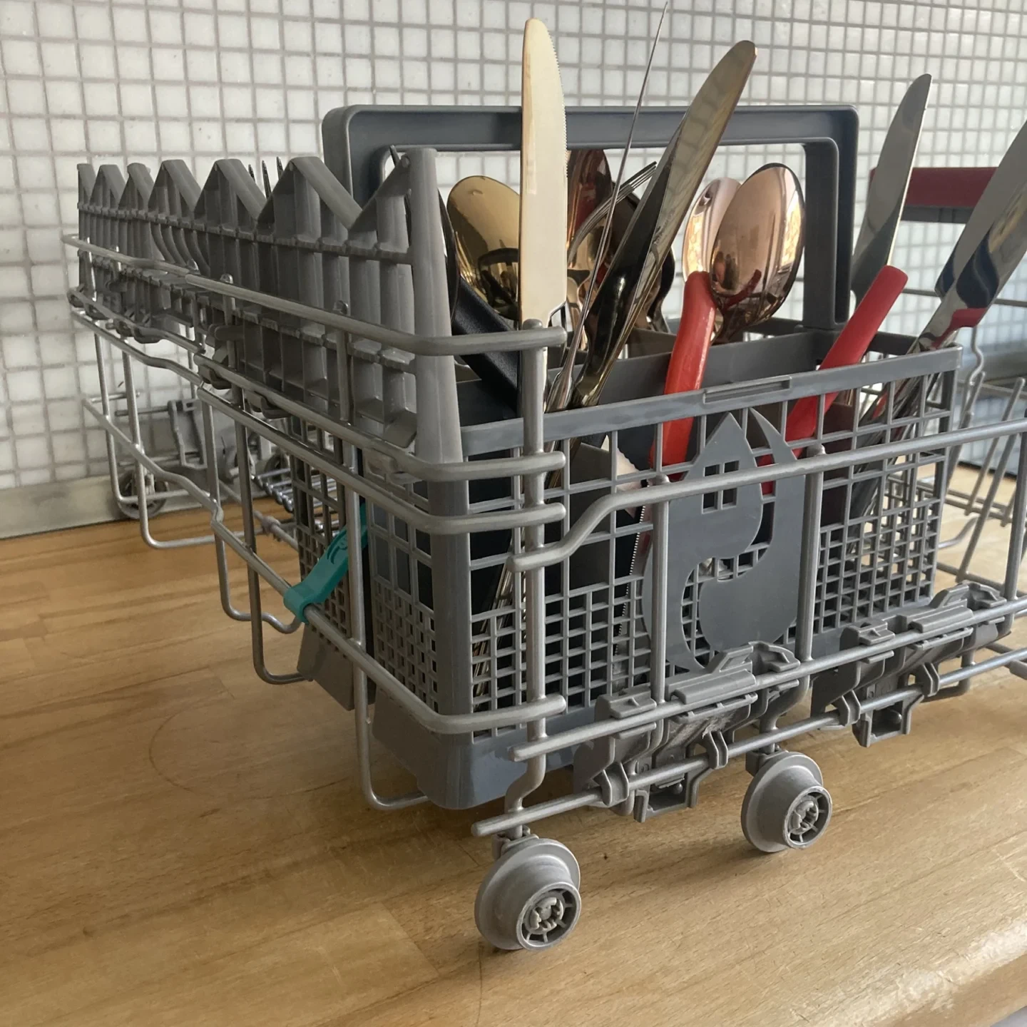 Die Flexibilität des Korbes ermöglicht die Aufnahme verschiedener Besteckarten durch sechs kleinere und ein größeres Fach, wobei eine zusätzliche Halterung von oben wünschenswert gewesen wäre. Dies ist jedoch mehr eine Designentscheidung und ist daher nicht negativ zu bewerten.