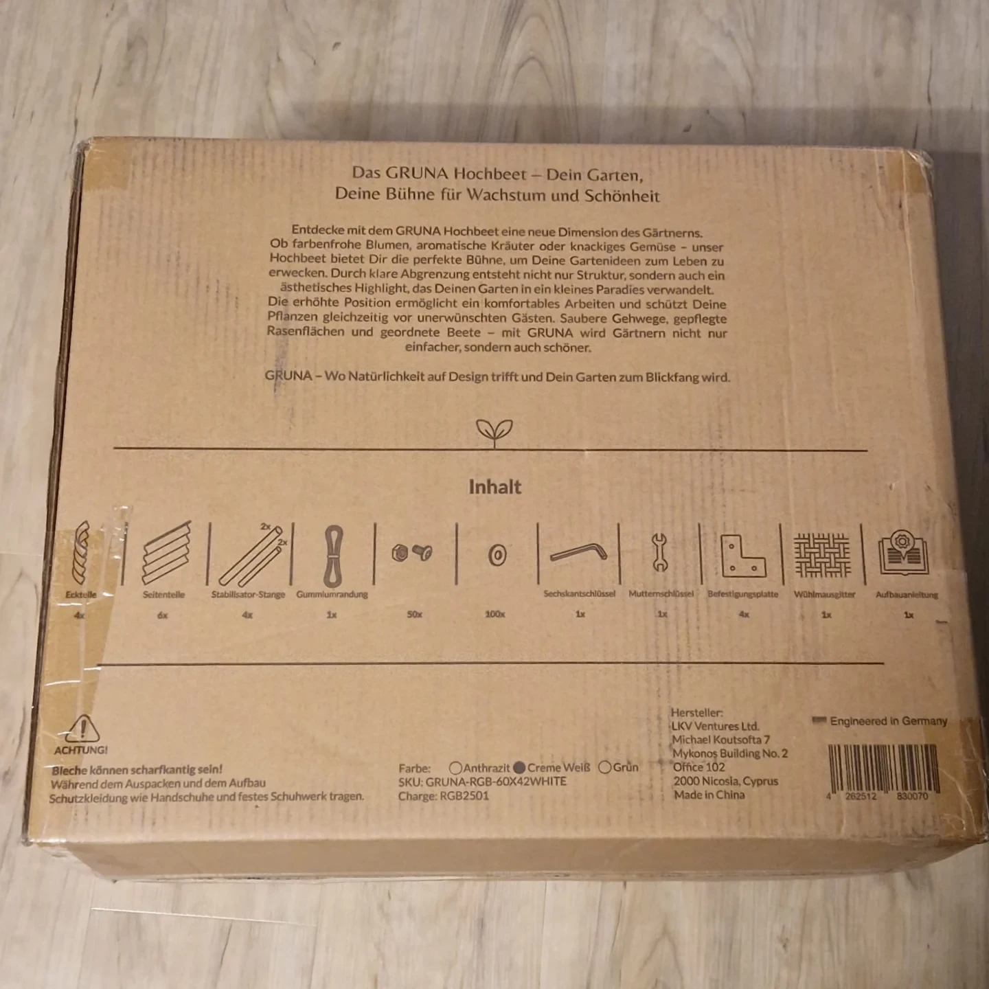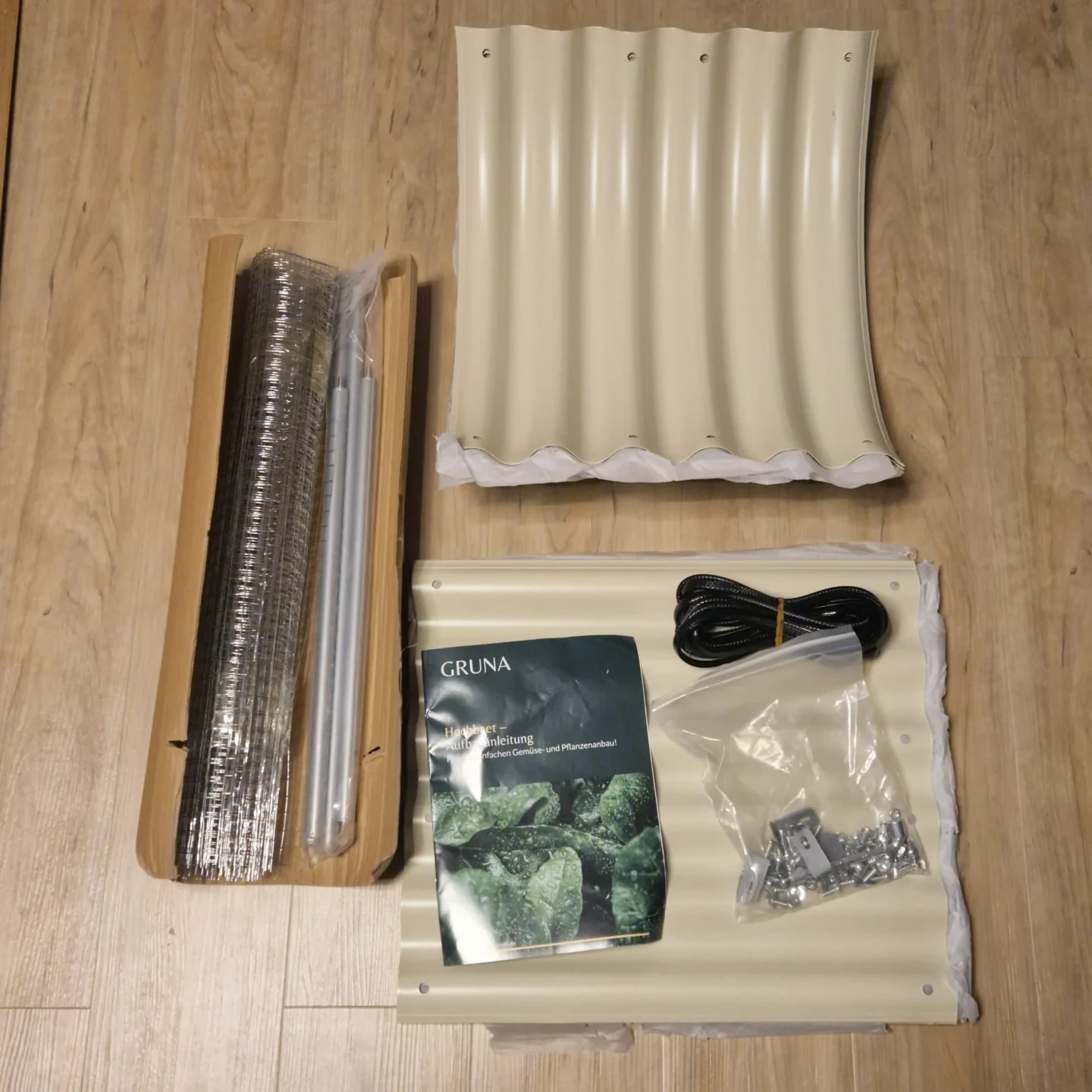Das Hochbeet wird mit großer Sorgfalt verpackt, um sicherzustellen, dass dieses während des Transports optimal geschützt ist. Der stabile Karton bietet eine zuverlässige Schutzschicht, die sicherstellt, dass das Produkt unbeschädigt bei ihrem Bestimmungsort ankommen. Trotz des Verzichts auf unnötigen Verpackungsmüll könnte die Verwendung von Plastikfolie für einige Verbraucher und Verbraucherinnen als kritisch angesehen werden. Die Produktverpackung enthält ein Bauset für das Hochbeet, ein Wühlmausgitter, einen Kantenschutz sowie Werkzeug. Außerdem liegt eine bebilderte Gebrauchsanleitung in deutscher Sprache bei.