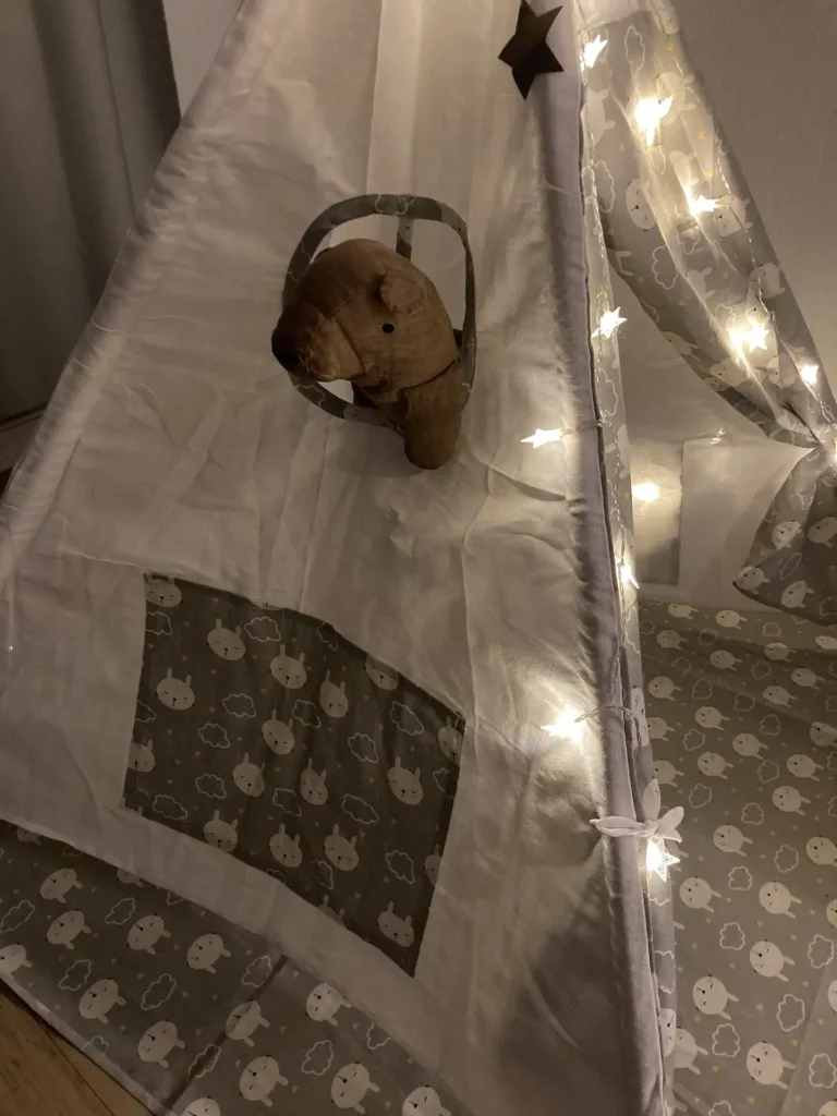 Einzig der Transport des Zeltes ist leider nicht ganz so einfach. Zwar lässt sich das Produkt mit wenigen Handgriffen platzsparend zusammenschieben – eine Tasche oder zumindest ein Seil, das die Stangen zusammen hält, wären dennoch wünschenswert. Selbst wenn man es nur kurzzeitig abbaut, um im Kinderzimmer Platz für andere Spielsachen zu schaffen, würde dies den Komfort erheblich verbessern. Insgesamt hinterlässt das Kinderzelt jedoch in unserem Praxistest einen sehr guten Eindruck. Dies bestätigt im Übrigen auch der im Rahmen dieses Praxistests eingebundene Teddybär, der sich – wie die Bilder zeigen – in seiner beleuchteten Unterkunft pudelwohl gefühlt hat.