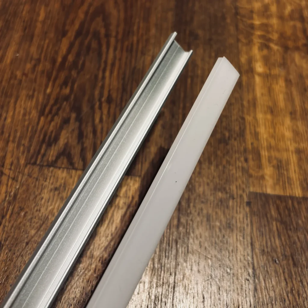 Bereits bei dem Auspacken hinterlässt das Aluminiumprofil einen insgesamt guten und sachlichen ersten Eindruck. Trotz seiner schlanken Bauform wirkt es wertig und vermittelt eine gewisse Materialstärke, ohne dabei massiv oder überdimensioniert zu erscheinen. Die Verarbeitung zeigt sich im Test als sauber und ordentlich. Die Oberflächen sind gleichmäßig ausgeführt, Kanten und Übergänge wirken sauber entgratet, ohne scharfe Stellen oder sichtbare Produktionsmängel. Der milchige Diffusor fügt sich passgenau in das Profil ein und erweckt einen stabilen Eindruck. Insgesamt deutet die Verarbeitungsqualität auf eine angemessene Fertigung für den vorgesehenen Einsatzzweck hin. Hinsichtlich der Stabilität wirkt das Aluminiumprofil formfest und ausreichend robust. Es lässt sich nicht ohne Weiteres verbiegen und scheint für eine dauerhafte Montage an Möbeln, Wänden oder Decken geeignet zu sein. Der Diffusor sitzt sicher im Profil und zeigt im montierten Zustand keinen Spielraum. Der Hersteller macht keine konkreten Angaben zur Nachhaltigkeit des Produkts. Positiv zu bewerten ist jedoch die Funktion des Aluminiumprofils als Kühlkörper für LED-Streifen. Durch die verbesserte Wärmeableitung kann die Lebensdauer der LEDs verlängert werden, was indirekt zu einer ressourcenschonenderen Nutzung beiträgt.
