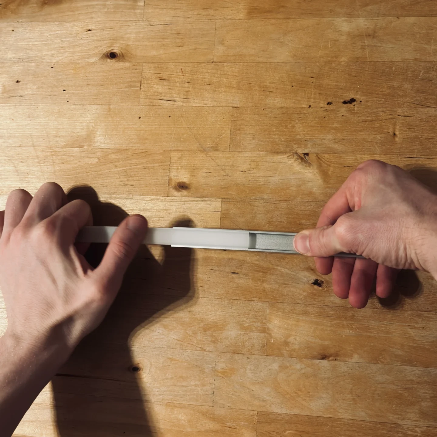 Das LED-Aluminiumprofil von INNOVATE überzeugte im Praxistest durch sein angenehmes Licht und seine Alltagstauglichkeit. Die Passgenauigkeit der LED-Streifen in der Schiene ist sehr gut. Gängige LED-Bänder mit einer Breite von bis zu elf Millimeter lassen sich präzise einkleben und sitzen sicher im Profil, ohne zu verrutschen. Zusätzlich fungiert das eloxierte Aluminium als Kühlkörper, wodurch entstehende Wärme zuverlässig abgeführt wird, was sich positiv auf die Lebensdauer der eingesetzten LEDs auswirken kann. Die Lichtwirkung fiel im Test überzeugend aus. Der milchige Diffusor sorgt für eine gleichmäßige Lichtverteilung, bei der einzelne Lichtpunkte deutlich reduziert werden. Das Licht wird weich gestreut, wodurch Blendungen minimiert werden und ein harmonisches, gleichmäßiges Lichtbild entsteht. Dies macht das Profil besonders für indirekte Beleuchtungslösungen geeignet. Bei der Handhabung zeigt sich das System jedoch nicht vollständig werkzeuglos. So erfordert das Einsetzen des Diffusors spürbaren Kraftaufwand, da dieser fest in das Profil eingeklickt werden muss. Insbesondere bei Montagen über Kopf ist dabei ein gewisses Maß an Fingerspitzengefühl erforderlich. Grundsätzlich ist eine Anpassung an unterschiedliche Längenanforderungen möglich, dies setzt jedoch handwerkliches Geschick voraus. So gelingt das Kürzen der zwei Meter Schiene nur mit einer Metallsäge und erfordert sauberes Arbeiten, um gerade Schnittkanten zu erzielen. In der Pflege überzeugt das LED-Profil hingegen durchweg. Sowohl die Oberfläche als auch der Diffusor lassen sich dank ihrer glatten Struktur einfach reinigen. Staub und Verschmutzungen können problemlos entfernt werden, während die LED-Streifen im montierten Zustand gut geschützt bleiben.