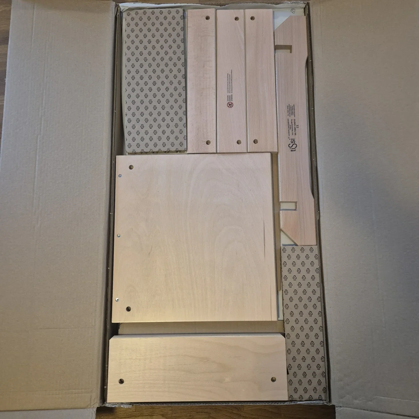 Der Lernturm Felix von tiSsi erweckt bereits bei dem Auspacken einen durchweg positiven Eindruck. Er wird in einem klassischen, stabilen Versandkarton geliefert, der das Produkt zuverlässig schützt und Professionalität vermittelt. Besonders hervorzuheben ist die kompakte Verpackungsweise. Alle Einzelteile sind platzsparend und sicher verstaut, wodurch Transportschäden effektiv vermieden werden.