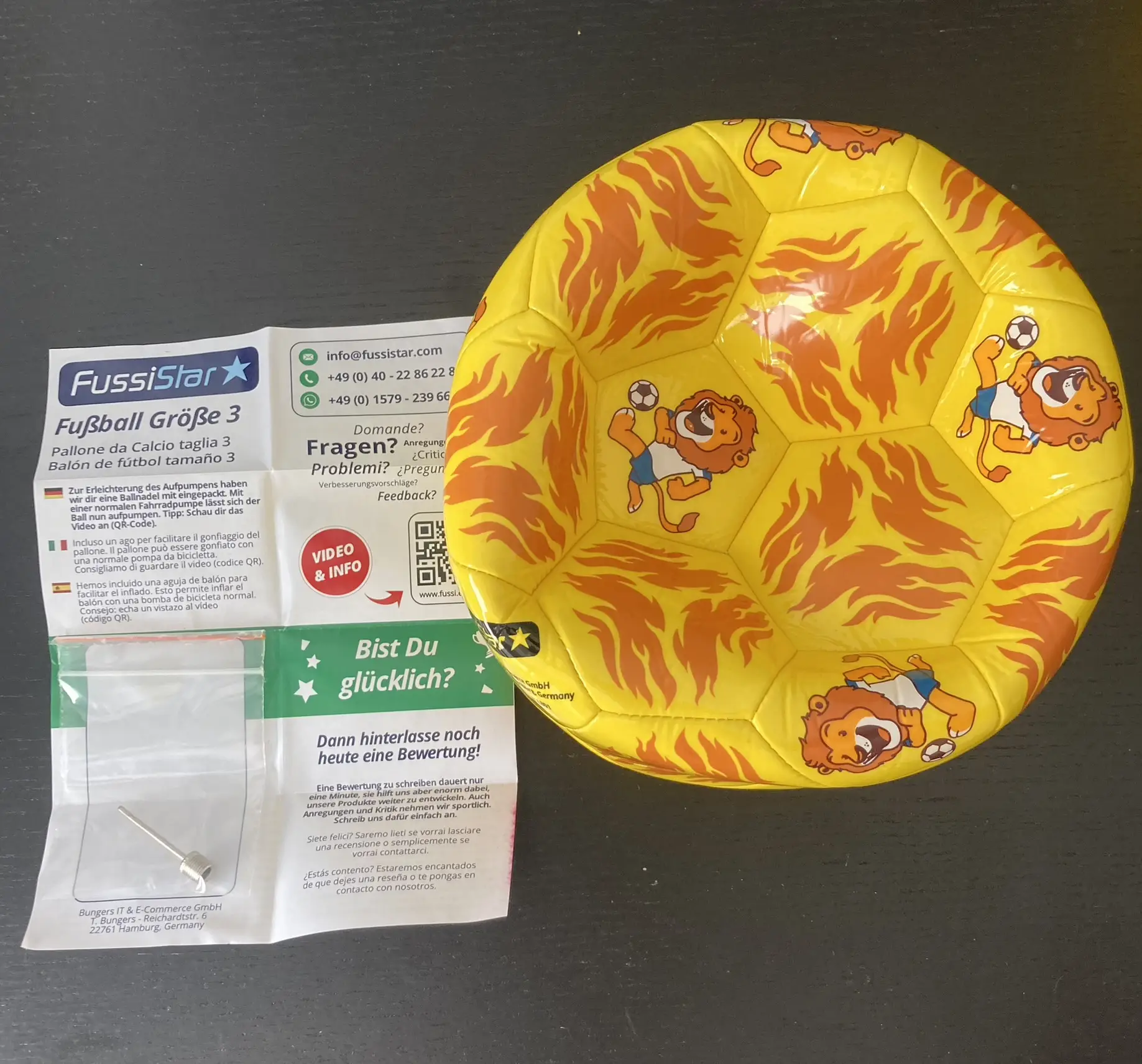De leeuwenvoetbal van het merk FussiStar maakt een zeer goede indruk bij het uitpakken. Hij wordt geleverd in een geel met blauwe kartonnen doos, die bedrukt is met een afbeelding van het product en de belangrijkste informatie en waarschuwingen. De doos is stevig en biedt voldoende bescherming voor het product. Tegelijkertijd is het karton zo compact mogelijk gehouden en volledig recyclebaar. Met het oog op duurzaamheid is er geen extra plastic gebruikt. In de doos zitten de bal, een luchtpompbevestiging en een gebruiksaanwijzing, ook al lijken deze bijna overbodig voor zo’n vanzelfsprekend product . De instructies verwijzen naar de klantenservice voor vragen en opmerkingen, evenals een uitgebreide robuustheidsgarantie van 6 maanden, die onmiddellijke hulp en de vervanging van een defect product belooft.