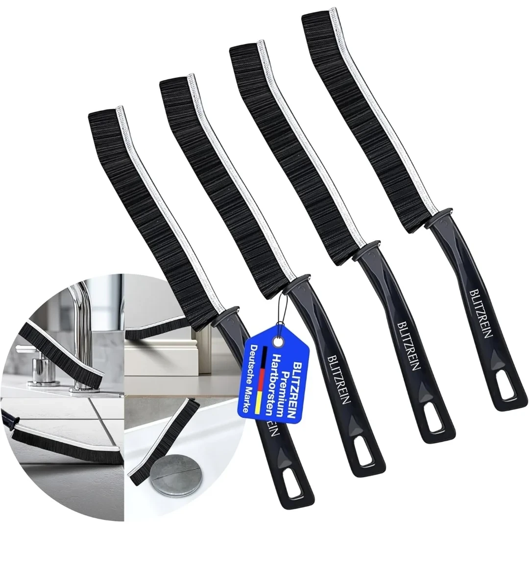 De BLITZREIN kierenreinigingsborstel is een complete kierenreinigingsborstelset die speciaal is ontwikkeld voor het grondig reinigen van hoeken, voegen en smalle spleten in huis, in de keuken en buitenshuis. De set bestaat uit vier hoekreinigingsborstels die ideaal zijn voor het reinigen van douches, afvoeren, wasmachines en stofzuigers. De voordelen van het product liggen in de robuuste harde borstelharen, die hardnekkig vuil effectief verwijderen, en de ergonomische handgreep, die een comfortabele bediening mogelijk maakt.