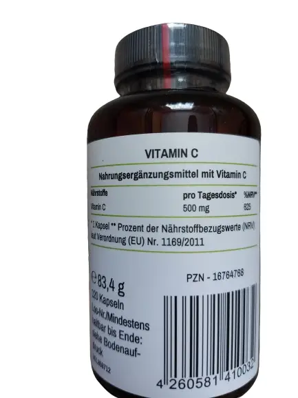 De vitamine C-capsules zijn zorgvuldig verpakt. De stevige kartonnen doos biedt voldoende bescherming tijdens het transport. Hoewel onnodig verpakkingsafval is vermeden, kan het gebruik van plastic folie mogelijk een punt van kritiek zijn voor sommige consumenten. De productverpakking bevat 1 blikje met 120 capsules. Op het blikje staat ook een consumptieadvies in het Duits.