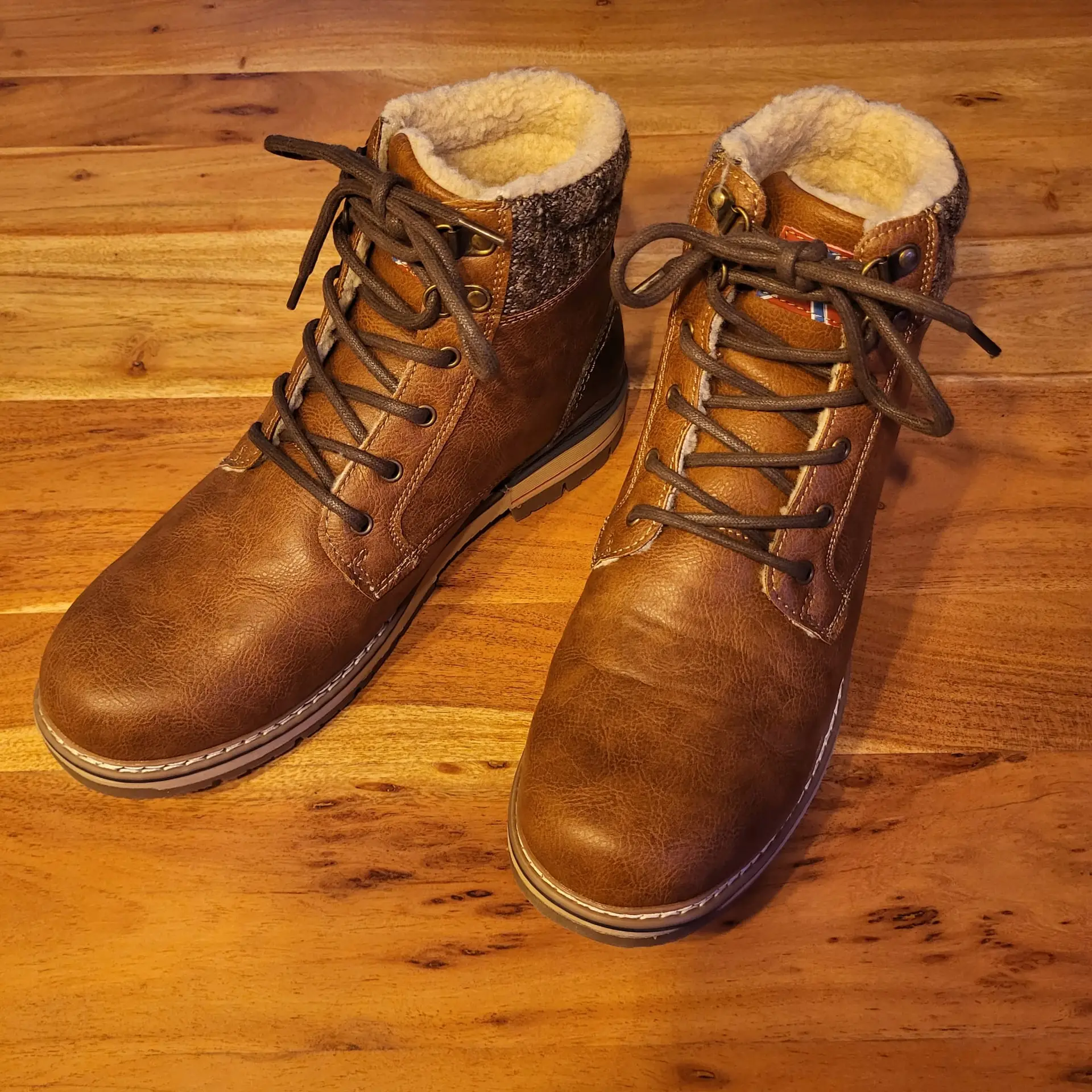 Ciepła podszewka wykonana jest z beżowego sztucznego futra. Sztuczna skóra użyta na powierzchni butów sprawia solidne wrażenie. Sznurowadła są osadzone w solidnych metalowych oczkach, dzięki czemu nie ocierają się bezpośrednio o materiał buta. Podeszwa składa się z dwóch warstw w różnych odcieniach brązu. Ma głęboki wzór bieżnika.