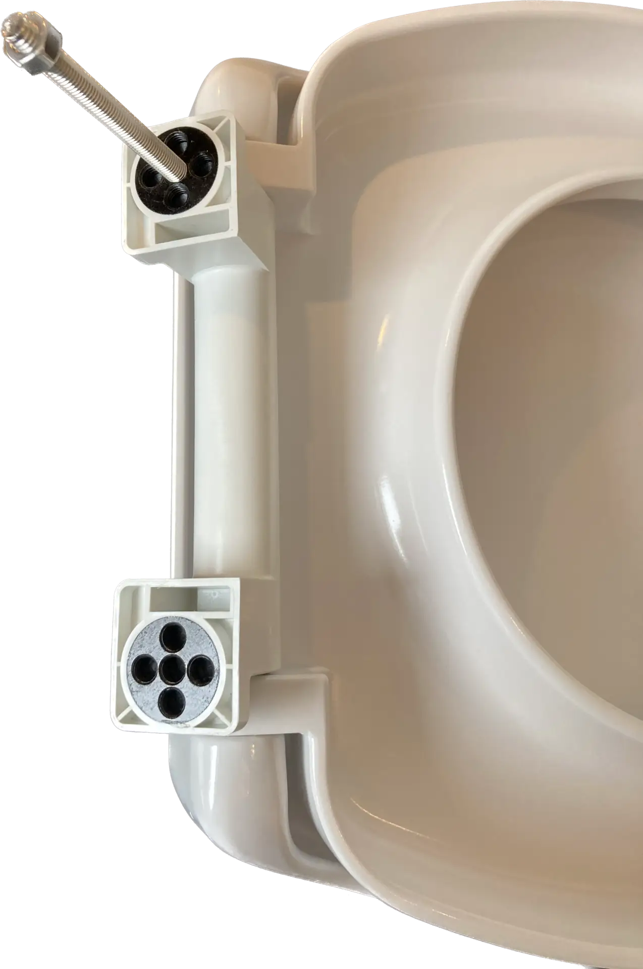 Na potrzeby naszego testu zamontowaliśmy i zdemontowaliśmy pokrywę na kilku owalnych toaletach. Prawdopodobnie przez przypadek potrzebowaliśmy tylko środkowego z pięciu otworów montażowych. Jednocześnie produkt oferuje pewien stopień elastyczności dzięki różnym rozstawom otworów . W reklamie produktu producent wyraźnie odnosi się do wymagań dotyczących montażu produktu. Nawet jeśli instalacja na toaletach z ukrytymi otworami montażowymi lub na toaletach o innym kształcie byłaby oczywiście rozsądna i pożądana , nie powinno to obniżać oceny produktu.