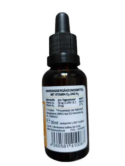 Pełni również funkcję w podziale komórek i przyczynia się do prawidłowego wchłaniania i wykorzystania wapnia i fosforu , a tym samym do prawidłowego poziomu wapnia we krwi. Witamina K2 kontroluje wchłanianie wapnia do kości i zębów oraz transportuje tam wapń w celu jego wbudowania. Witamina K przyczynia się do prawidłowego krzepnięcia krwi. Witamina D3 jest rozpuszczona w wysokiej jakości oleju kokosowym MCT i wspiera idealne wchłanianie dzięki swojej formie podania. Olej z witaminą D jest optymalnie chroniony przed światłem w butelce z bursztynowego szkła.