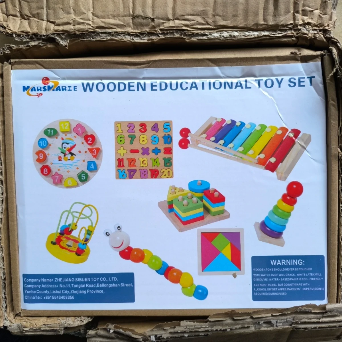 Bei dem Produkt Spielzeug Set 8in1 Montessori von der Marke Solyva handelt es sich um ein kreatives Spieleset für Kleinkinder. Die einzelnen Komponenten sind aus wertigem, in bunten Farben angestrichenem Holz. Enthalten im vielseitigen Set sind ein Holzinstrument, eine Uhr, ein Zahlenbrett, ein Puzzle, Stapelspiele und ein Geschicklichkeitsspielzeug.