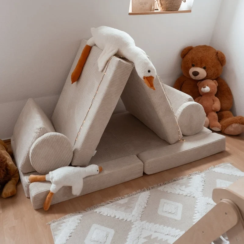 Das Spielsofa Cord Grande der Marke Design4Kids ist ein vielseitiges Möbelstück, das Funktionalität, Komfort und ein kindgerechtes Design ideal miteinander verbindet. Mit einer Breite von 172 Centimetern bietet es genügend Platz zum Spielen, Toben und Entspannen für Kinder von eins bis vierzehn Jahren sowie für Erwachsene. Besonders hervorzuheben ist die hochwertige Verarbeitung „Made in Germany“, die Langlebigkeit und Sicherheit garantiert. Der abnehmbare und waschbare Bezug (30 °C, OEKO-TEX-zertifiziert) macht das Sofa zudem äußerst pflegeleicht. Durch die kompakte, vakuumverpackte Lieferung entfaltet sich das Sofa innerhalb weniger Stunden vollständig und ist nach etwa 12 Stunden komplett knitterfrei. Mit seinen praktischen Tragegriffen und der Möglichkeit, es als Schlafcouch für Erwachsene zu nutzen, erweist sich das Spielsofa Cord Grande von Design4Kids als echtes Multitalent für Familie und Kinderzimmer.