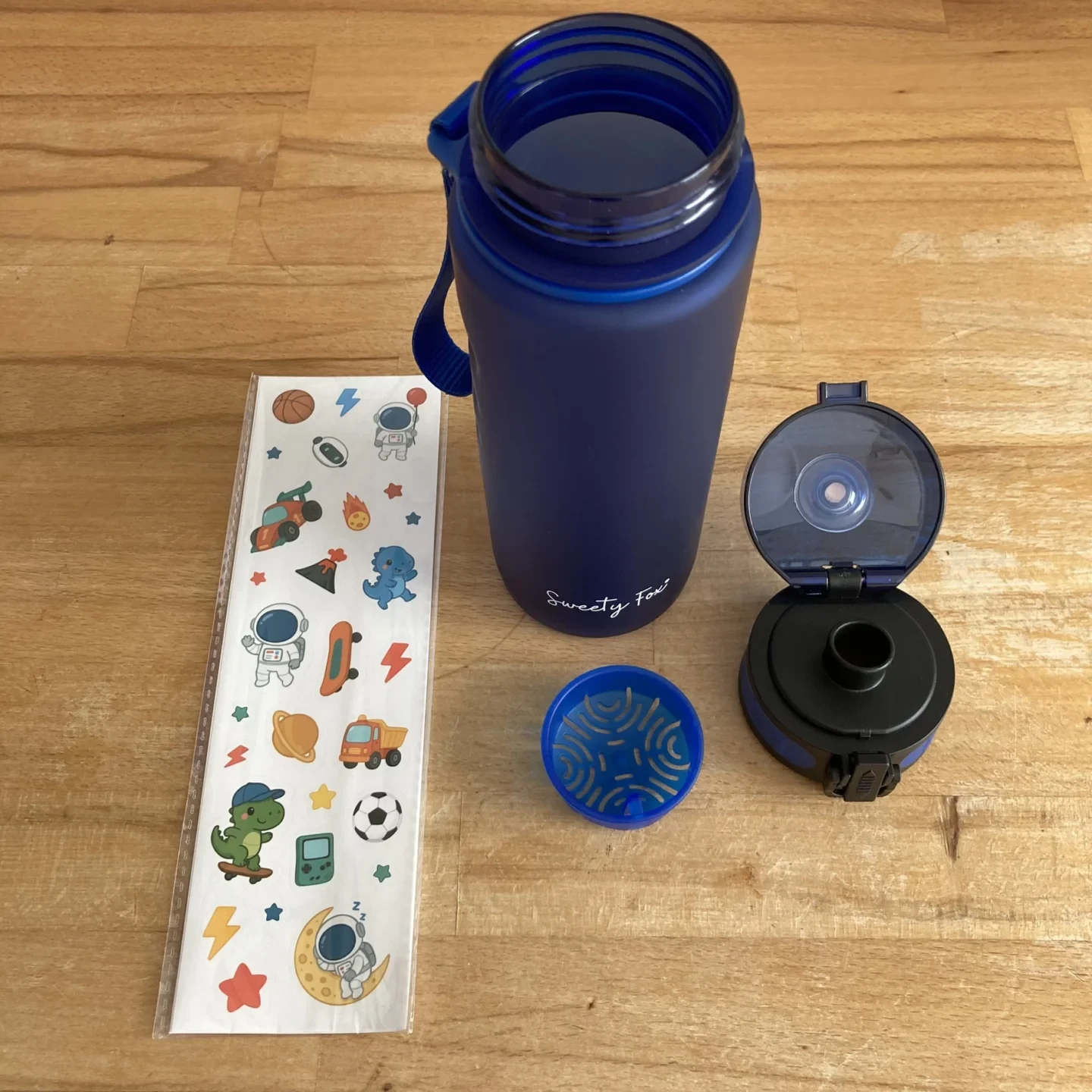 Der Lieferumfang ist vollständig und umfasst neben der Flasche selbst einen Sieb-Einsatz für Kräuter, Früchte etc. sowie mehrere Sticker-Bögen zur Personalisierung, die besonders für Kinder einen zusätzlichen Mehrwert bieten. Die Sticker sind farbenfroh gestaltet und sind darüber hinaus praktisch, um Verwechslungen in Schule oder Kindergarten zu vermeiden.